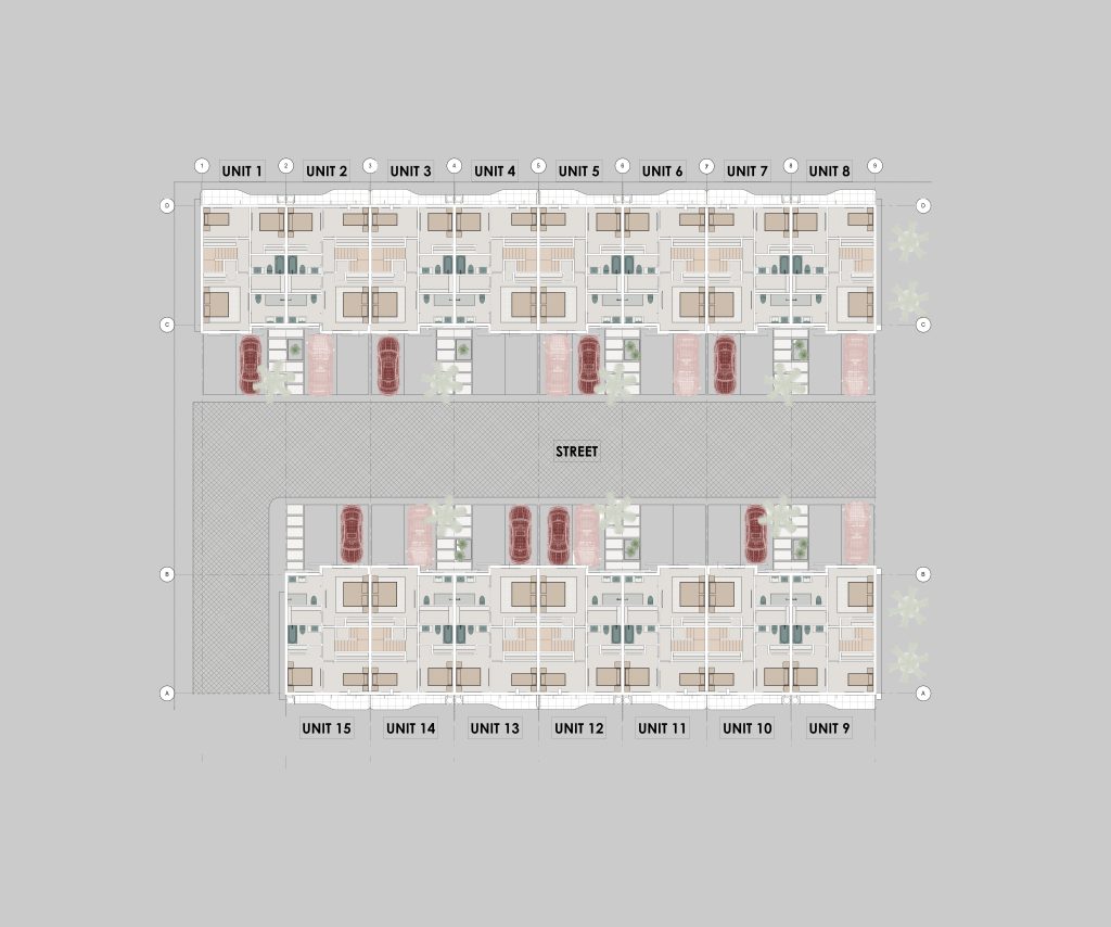 Entrega de planimetría para licenciamiento con la ciudad, producción técnica de dos bloques de edificios conformados por una vivienda tipo dúplex que se replica en 14 unidades más, para formar un nuevo conjunto residencial en el estado de Florida, USA.